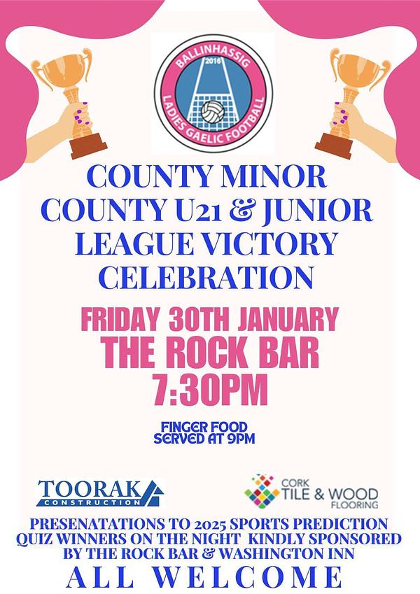 Join our Minors, U21’s and Junior ladies teams for a victory celebration night. All members are welcome to celebrate a great year for the girls and Ballinhassig LGFA in 2025.