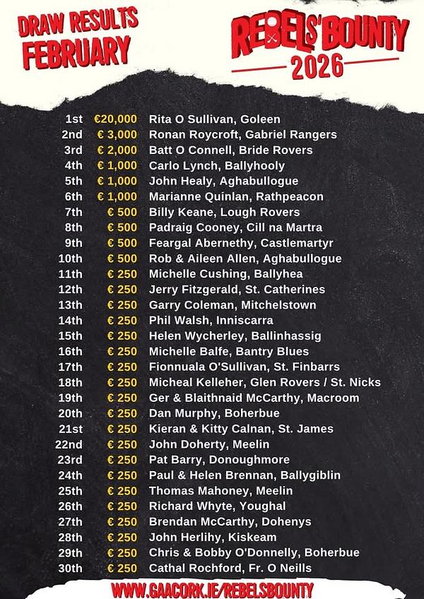 A big thank you goes to everyone who supported Ballinhassig GAA club in the Rebels’ Bounty this year.